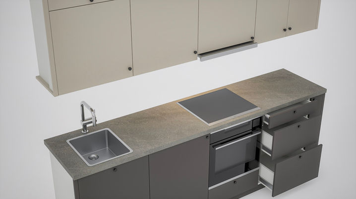 Šī moderna virtuve pēc pasūtījuma ir lielisks risinājums nelielām telpām, kur svarīgs ir gan dizains, gan praktiskums. Izmantoti augstas kvalitātes Egger lokšņmateriāli un uzticama Blum furnitūra nodrošina gan vizuālo pievilcību, gan ilgmūžību. Pārdomāts skapīšu un atvilktņu izkārtojums ļauj maksimāli izmantot katru centimetru, saglabājot telpas vieglumu un kārtību.